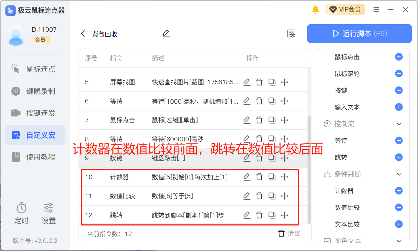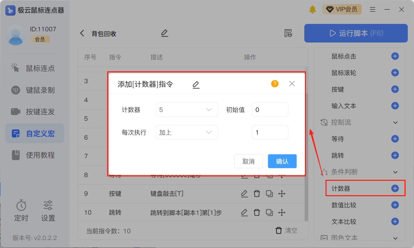 步骤十八:设置循环次数,在脚本C跳转指令前可以添加【计数器】和【数值比较】指令,例如【计数器】设置变量5,初始值0,每次执行加1;【数值比较】设置计数器5相等5就停止执行,否则继续下一步。每执行一次计数器就会加1,当计数器数值为5,在数值比较中对应的条件等于5则会结束该脚本。