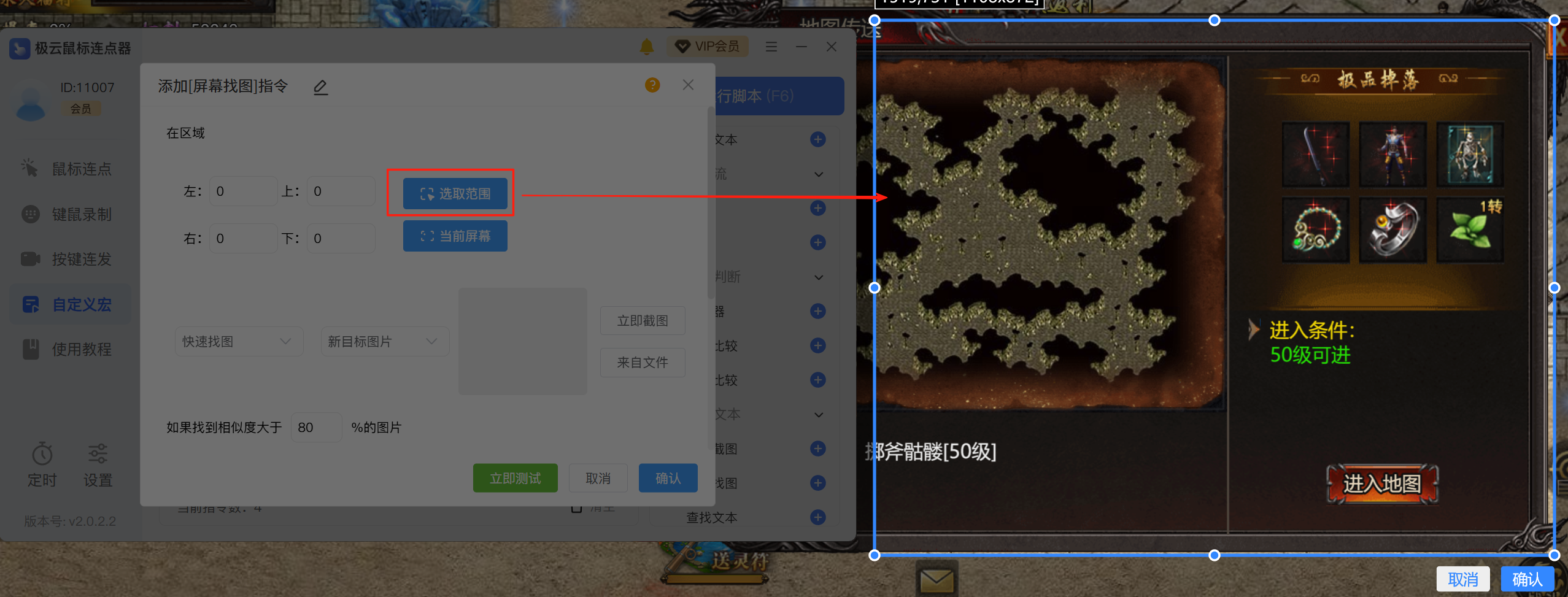 步骤十一:添加【屏幕找图】指令,这里就是重复上述的操作,选取范围,截取需要查找的图即可,每次都测试下是否可以精准找到