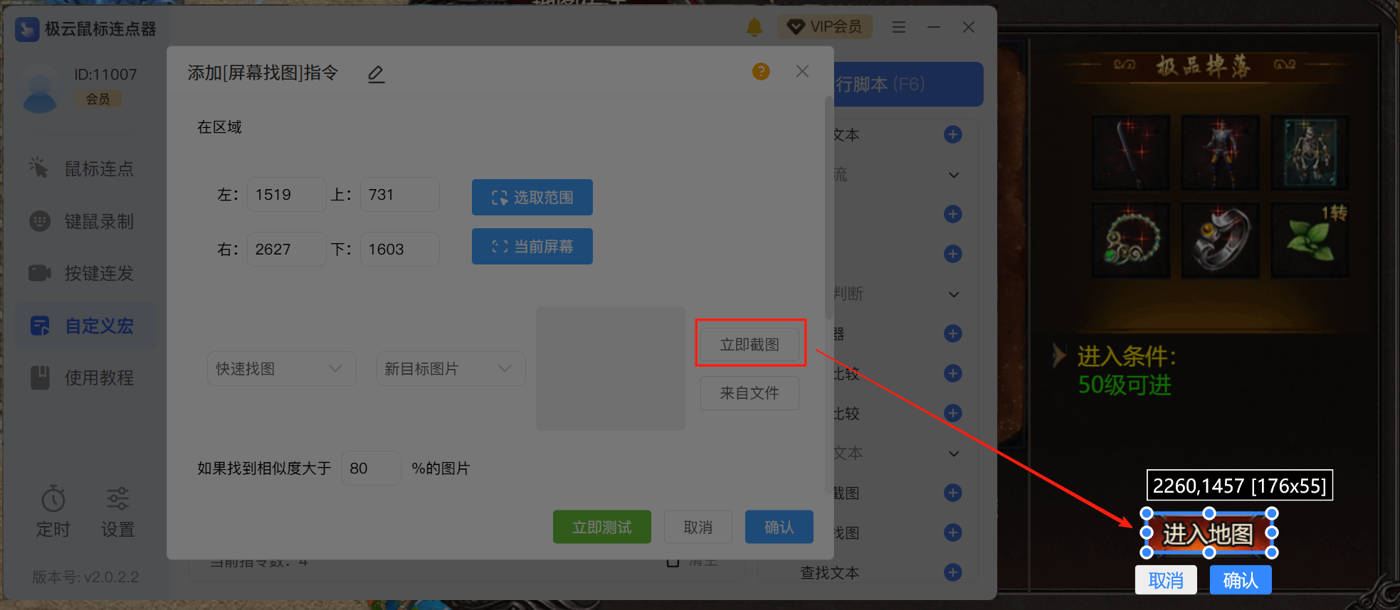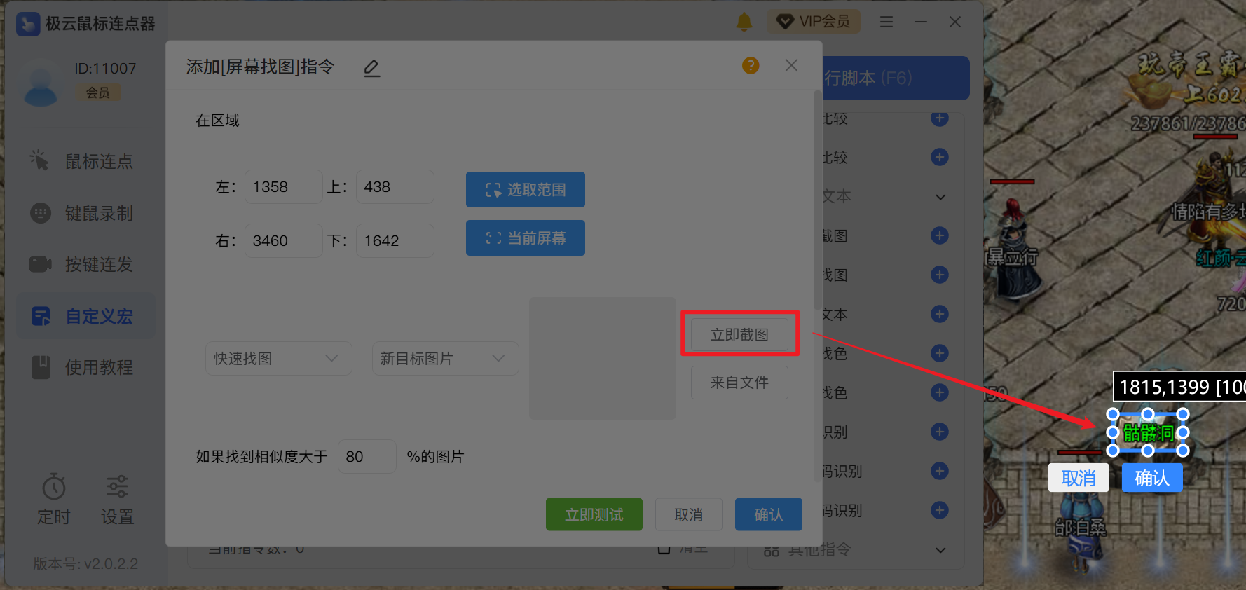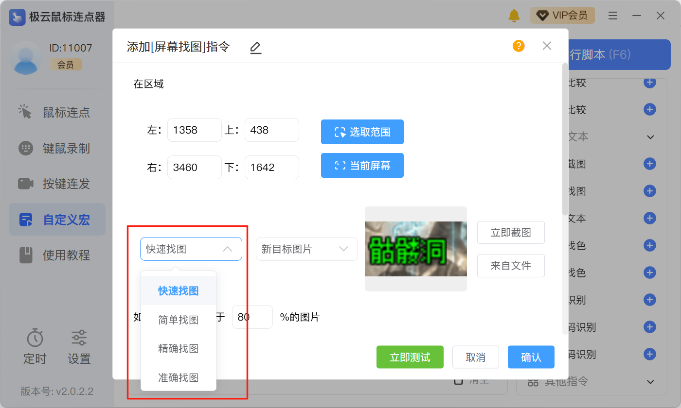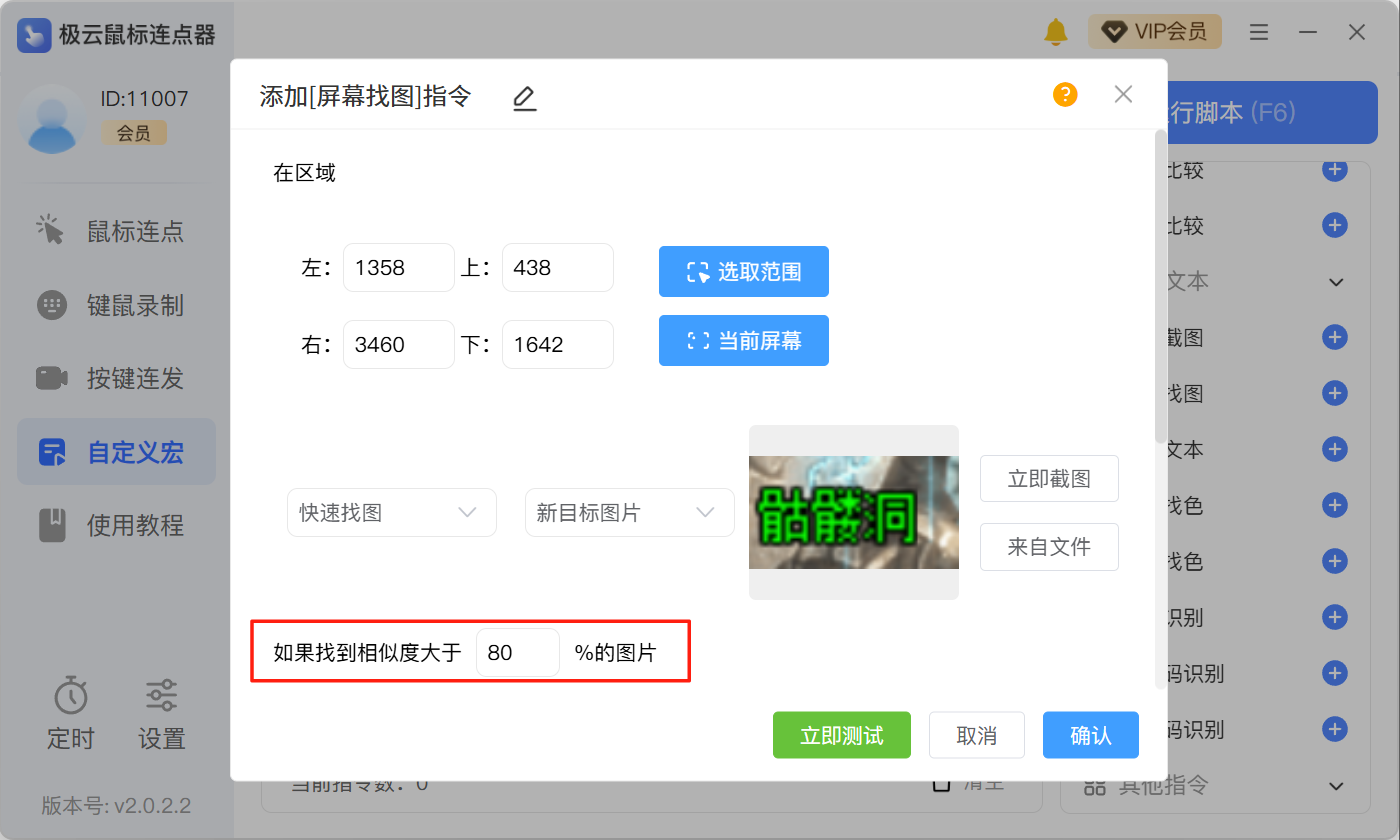 步骤六:点击【立即测试】,确认是否可以精准找到图,若未找到可以通过调整查找模式、相似度、以及选取范围解决