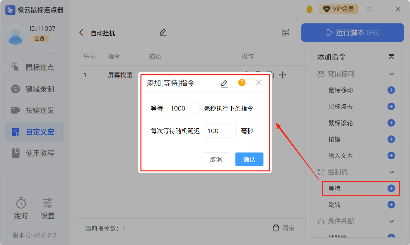 步骤八:添加【等待】指令,使上下两个指令之间有个间隔时间,也可以设置随机延迟时长,更好的规避反作弊机制