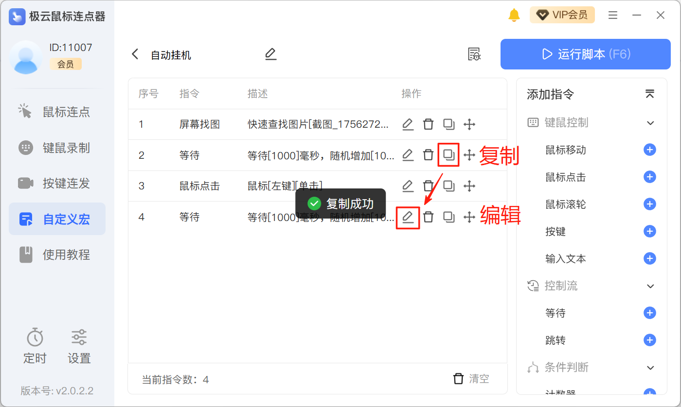 步骤十:添加【等待】指令,这里可以直接复制序号2的等待指令进去修改即可,人物需要走到点击位置,时间需要留长,这里的等待时间可以适当加长