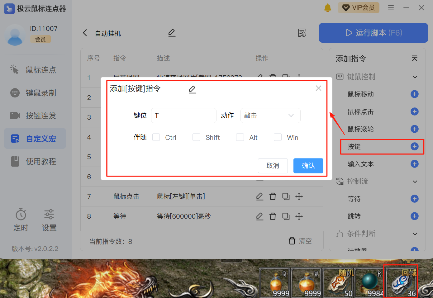 步骤十五:添加【按键】指令,可以通过快捷键回城