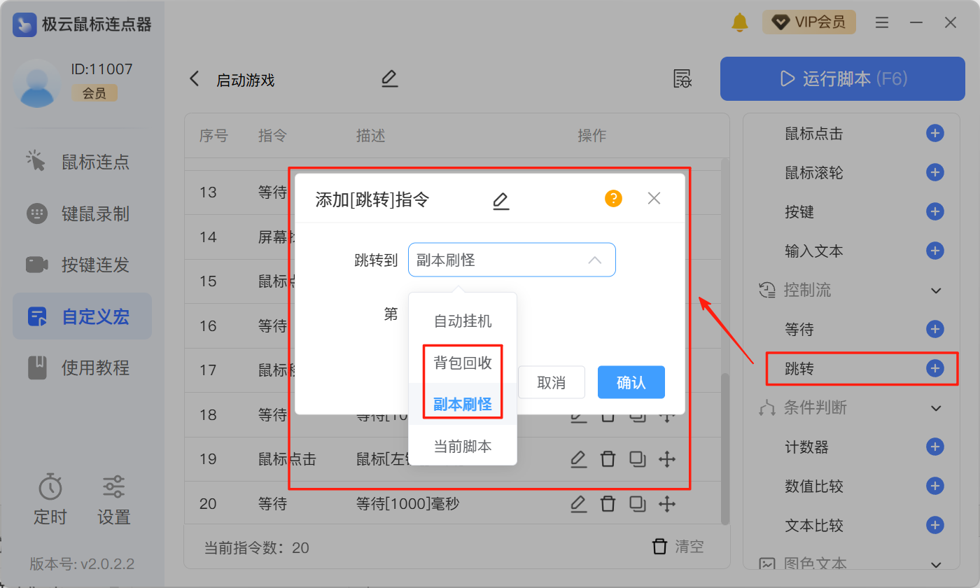 步骤十七:在脚本A的最后一步添加【跳转】指令跳转到脚本B,脚本B的最后一步添加【跳转】指令跳转到脚本C,脚本C的最后一步添加【跳转】指令跳转到脚本B,循环往复执行