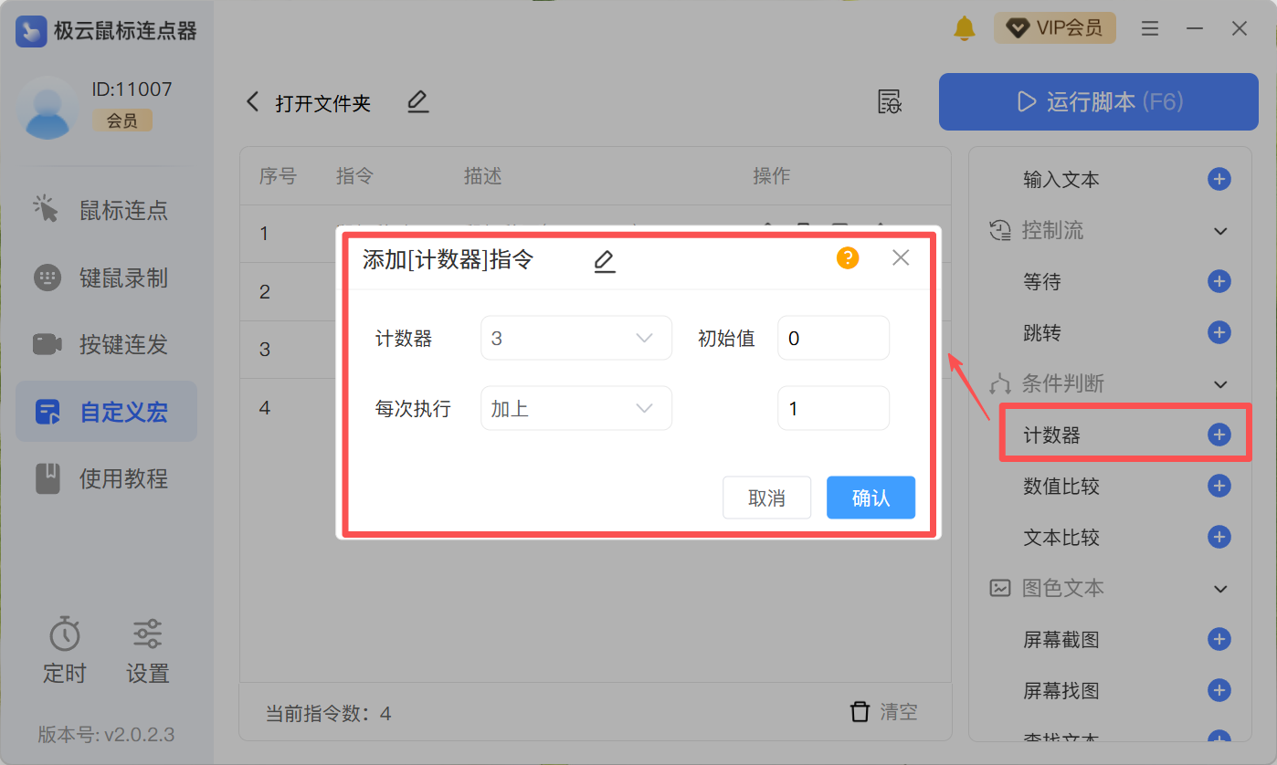 步骤一:在需要循环的最后一步添加【计数器】指令,输入变量名称(这里我们方便记录设为3),初始值为0,每次执行加上1。